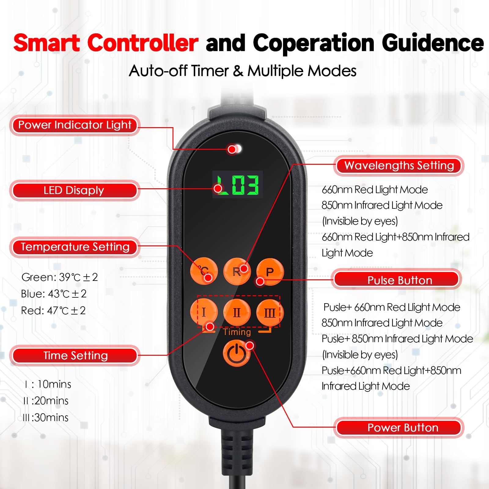 Auto-off Shut Timer & Temperature Setting : The Near Infrared Light Therapy Wrap for Knee is upgraded with led screen. You can choose the wavelengths and pulse mode just you like. Temperature can be adjusted to 3 levels, like 39℃±2℃, 43℃±2℃ and 47℃±2℃. And it has a auto-off shut function for 10/20/30 mins. So you no longer need to worry about safety and excessive temperature after long use or deep sleep.